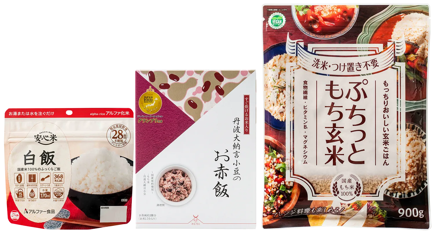 炊いたり蒸したご飯を、熱風で急速乾燥させたお米。この乾燥させたアルファ化米は、水分が少ないため腐りにくい状態を維持しながら、炊飯したご飯と同じデンプン構造をしているため、おいしさもそのままなんです。さらにアルファ化米は洗米・つけ置きの必要がなく、短時間で炊きあがるので、通常のお米より早く簡単に調理することができます。