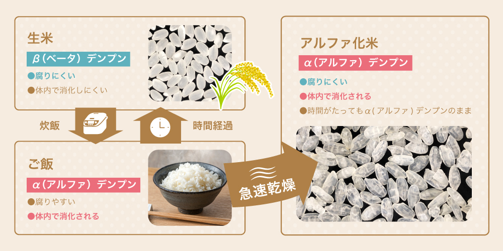 お米にはエネルギー源となるデンプンが含まれています。お米のデンプンには2種類あり、生のお米は水分が少ないため腐りにくいけれど食べても消化されにくい「β(ベータ)デンプン」、炊飯したご飯は体内で速やかに消化されるものの水分が高く腐りやすい「α(アルファ)デンプン」の状態です。