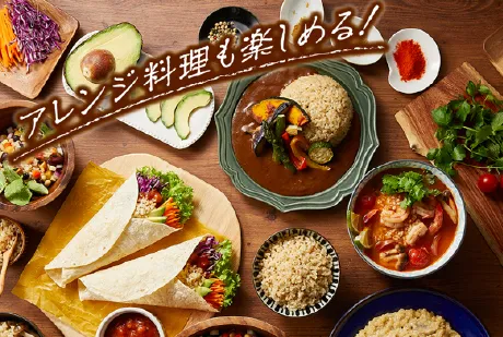 玄米は和食やあっさりとした食事と合わせるイメージを持たれがちですが、ぷちっともち玄米は、カレーや麻婆豆腐、ハンバーグなど白米と同様に様々なおかずと一緒においしく召しあがっていただけます。また、炊き込みご飯やカオマンガイへのアレンジのほかにも、茹でる調理にも対応しているので、グレインズ(穀物)サラダやスープご飯など、多彩なメニューにご使用いただけます。
