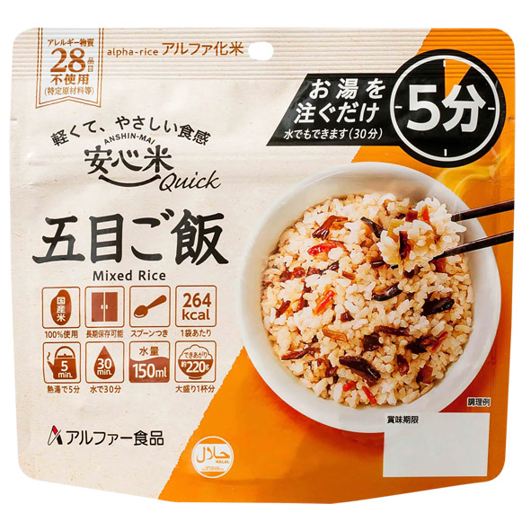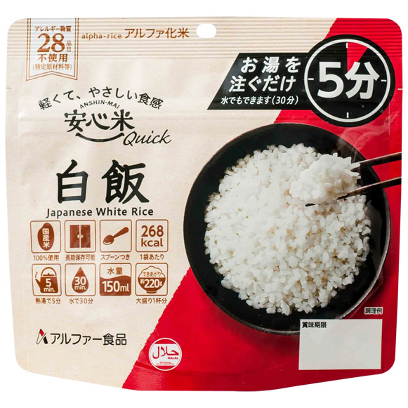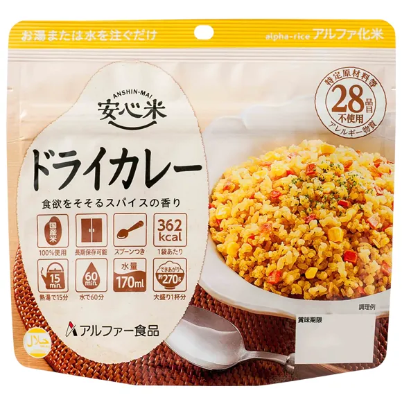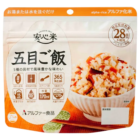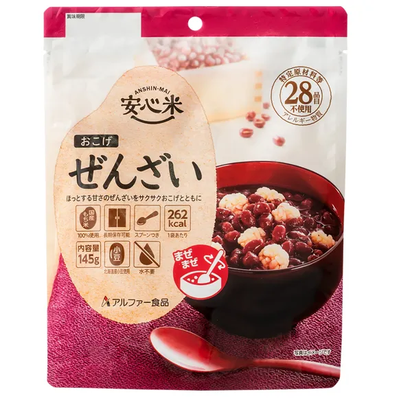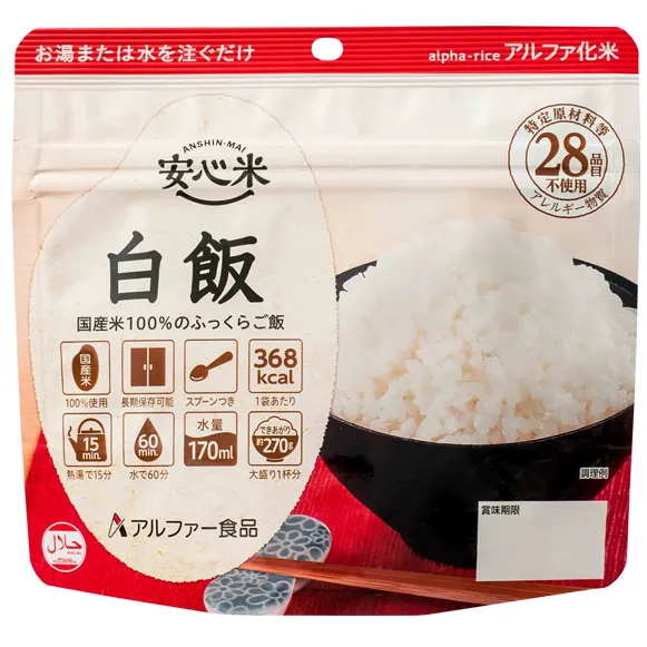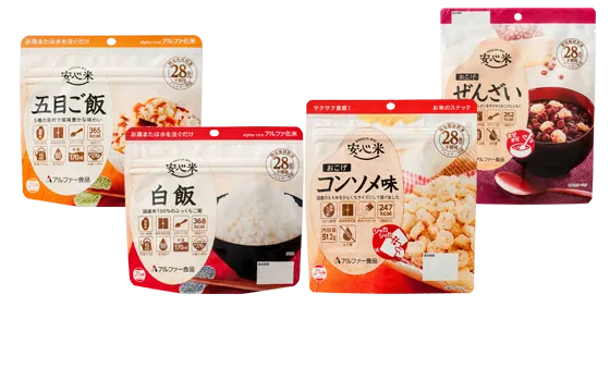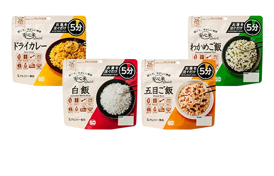 国産米を100%使用し、全商品食物アレルギーをお持ちの方に配慮した特定原材料等(28品目)不使用商品のため、安心して召しあがっていただけます。袋にお湯を注ぎ、添付のスプーンでそのまま食べられるのでお皿は不要です。電気やガスがない非常事態には水を注ぐだけで食べることができます。バラエティに富んだラインナップをご用意しておりますので、お好みに応じてお選びいただけます。