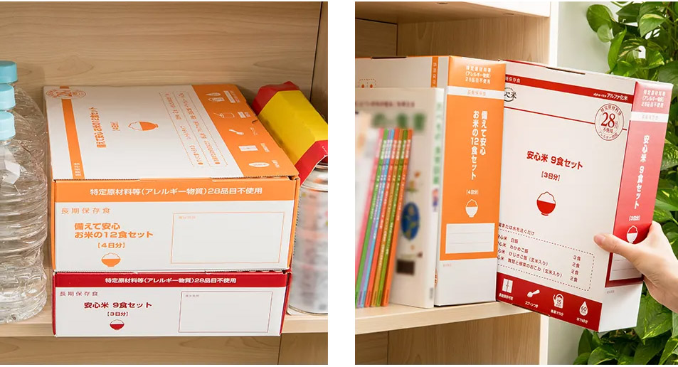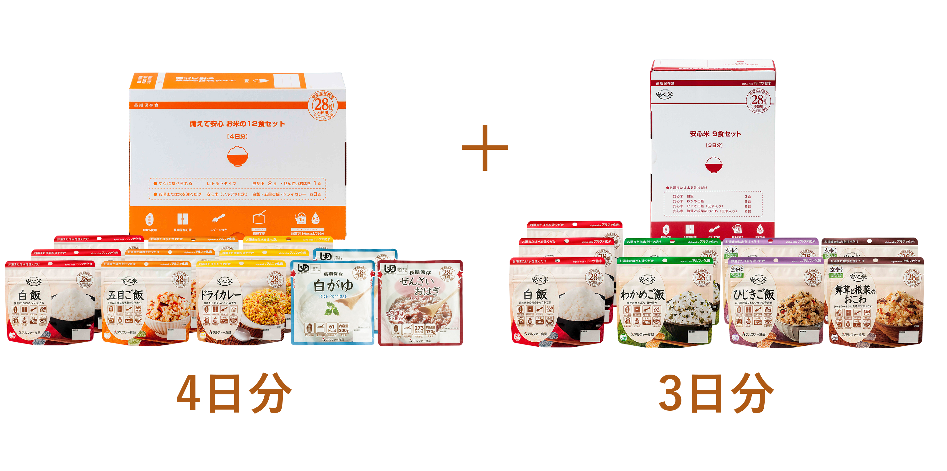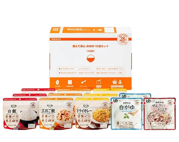 発災当日(調理不要レトルトタイプ3食分)+3日間(お湯や水を注ぐだけで食べられるアルファ化米9食分)=計4日 間を想定したお米の12食分のセットです。