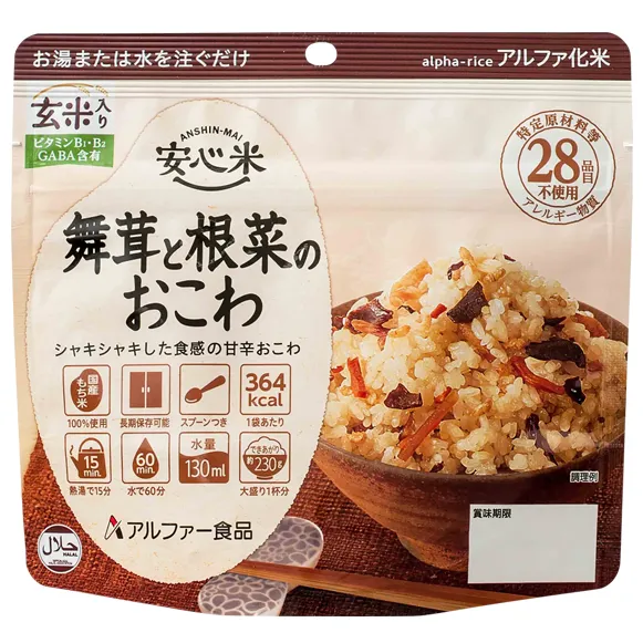 香ばしい玄米と、ビタミンB1・B2、GABAをプラスした、安心米の「からだを 想うシリーズ」です。国産もち米100%使用。舞茸と3種の根菜(れんこん・ごぼ う・にんじん)を使用したシャキシャキした食感の甘辛おこわです。