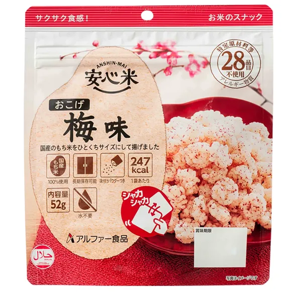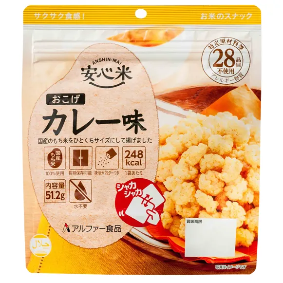 調理が不要なため、震災直後でも、火や水を使わずに食べられます。国産のもち米をひとくちサイズにして揚げたサクサク食感のおこげと、調味粉末または、ぜんざいがセットになった商品です。