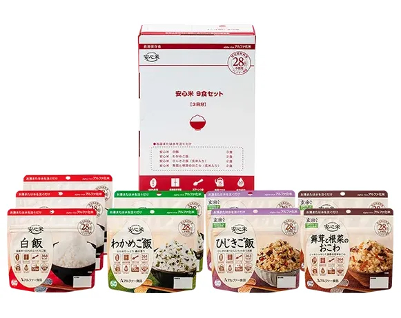 『白飯』、『わかめご飯』、『ひじきご飯(玄米入り)』、『舞茸と根菜のおこわ(玄米入り)』の4種類を詰め合わせた、救援物資が供給開始されるまでの最低3日分(一人当たり3食×3日分=9食)のセットです。