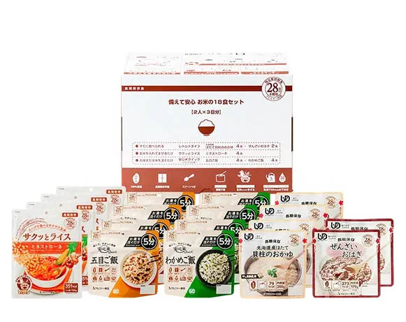 「2人×3日分」を想定したお米の18食分のセットです。「早く食べられる」ことをコンセプトに、調理不要ですぐに食べられるレトルトタイプ、玄米を入れてまぜるだけのサクッとライス、お湯を注げば5分で食べられる安心米クイックを組み合わせました。