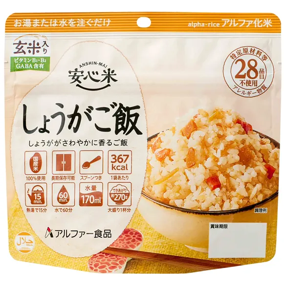 香ばしい玄米と、ビタミンB1・B2、GABAをプラスした、安心米の「からだを 想うシリーズ」です。国産うるち米100%使用。あっさりした味付けに仕上げた、 しょうががさわやかに香るご飯です。