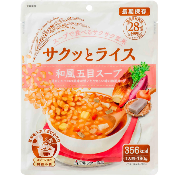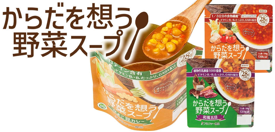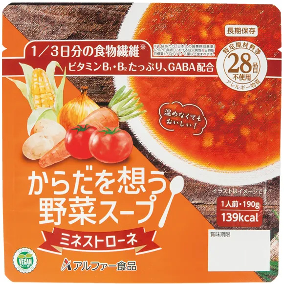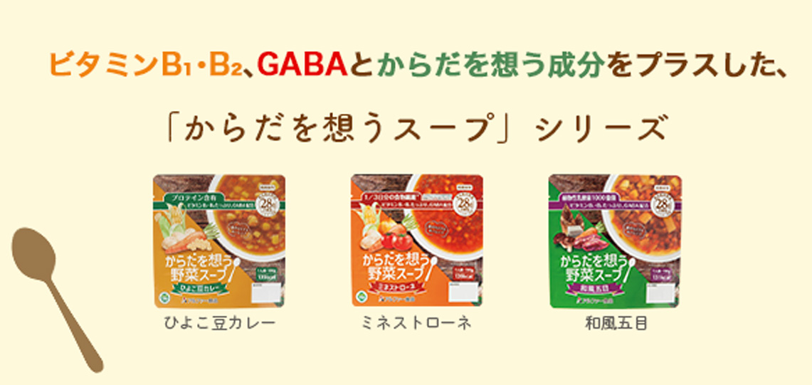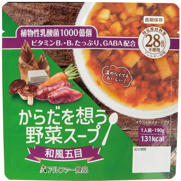 植物性乳酸菌1000億個を配合、たっぷりのビタミンB1・B2を摂取可能。さらにGABAを配合しています。さつまいも・にんじん・こんにゃく・たけのこ・しいたけを使い、かつおの風味と旨味が詰まった やさしい味の和風五目スープに仕上げました。