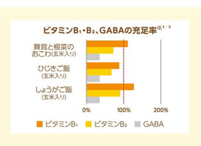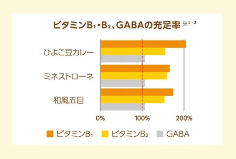 ※1 ビタミンB1・B2は、厚生労働省「避難所における食事提供の計画・評価のために当面目標とする栄養の参照量」において、避難時1日の目標とされる量(ビタミンB1 1.1㎎/日、ビタミンB2 1.2㎎/日)を100%として計算。含まれるビタミン量は、パッケージ表示幅の中間値を使用。