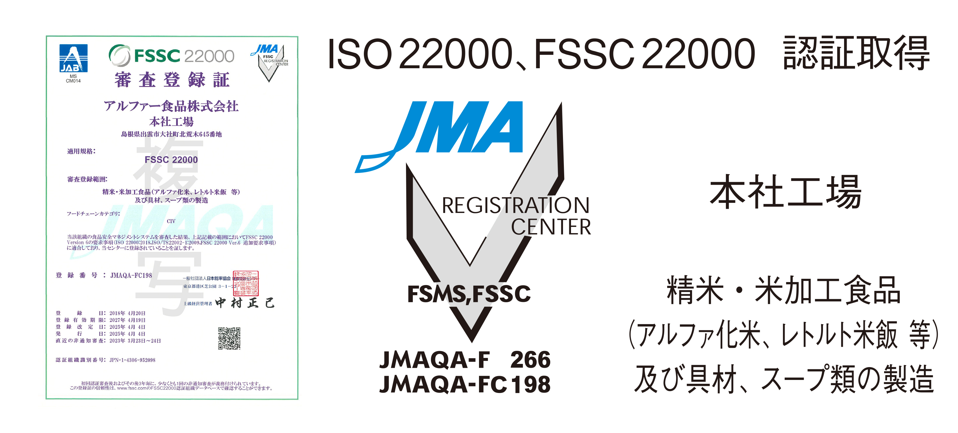 食品安全の国際規格であるFSSC22000及びISO22000を認証取得しました(本社工場)。FSSC22000はオランダの食品安全認証財団が開発した食品安全についての国際規格であるISO22000に、一般衛生管理、フードディフェンス等の追加要求事項が加わった国際規格です。